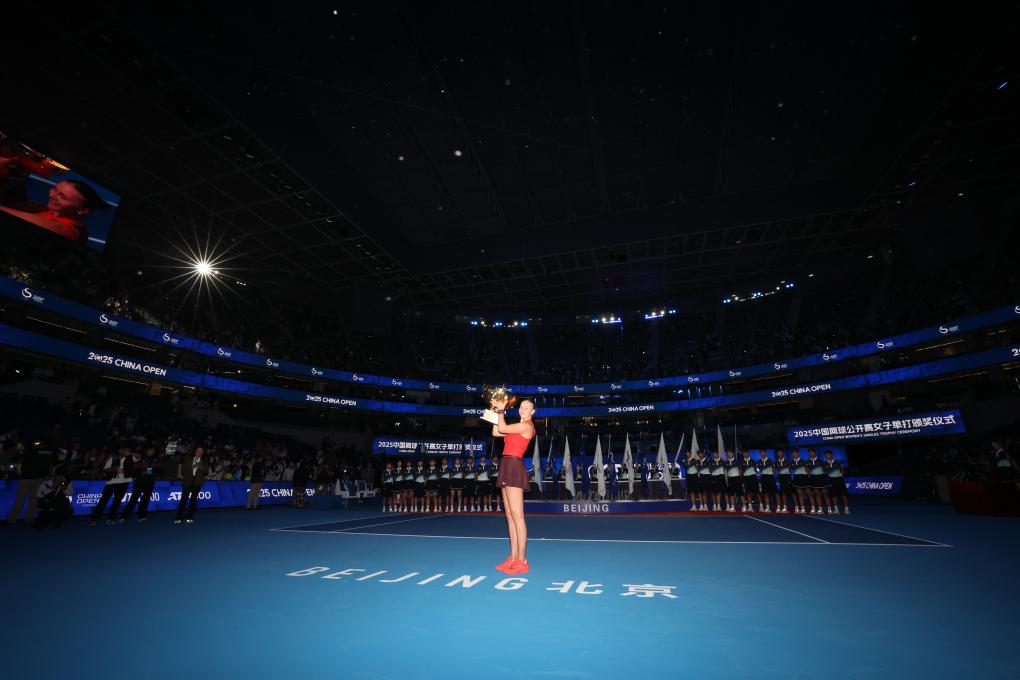 ↑2025年10月5日,阿尼西莫娃夺得中网女单冠军。新华社记者 白雪飞 摄