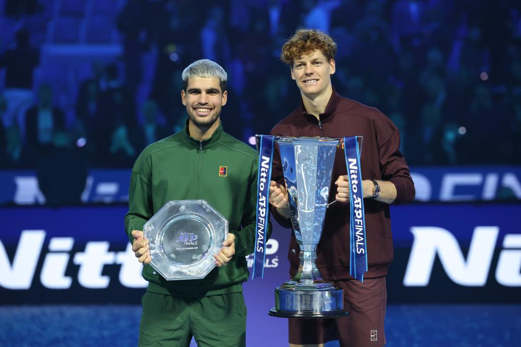 ↑2025年11月16日,辛纳(右)与阿尔卡拉斯在ATP年终总决赛男单决赛后合影,辛纳夺冠。新华社记者 李京 摄