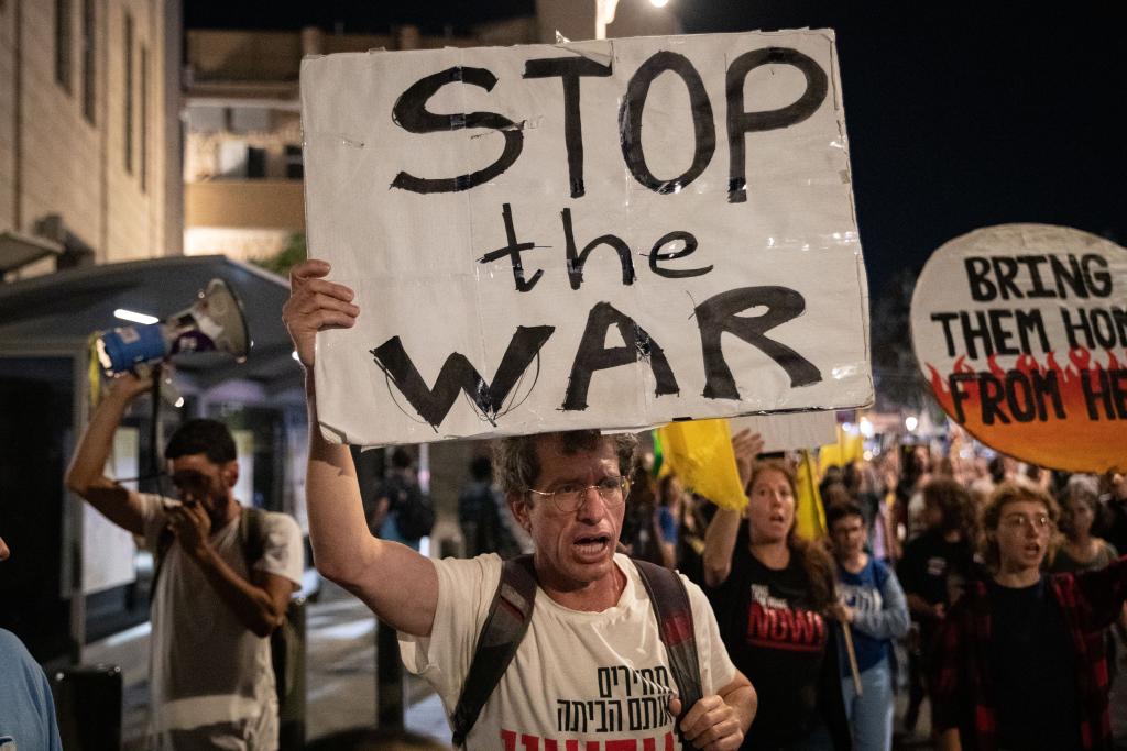 2025年10月4日,人们在耶路撒冷参加游行集会,要求政府迅速在加沙地带实现停火。