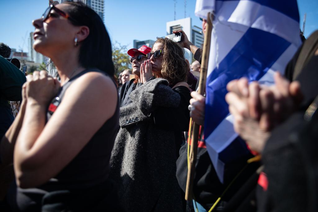 2025年2月15日,在以色列特拉维夫一处广场,人们通过户外屏幕观看被扣押人员释放过程。
