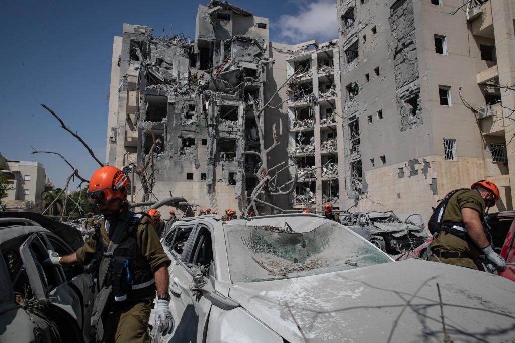 2025年6月24日,应急和救援人员在以色列南部贝尔谢巴的导弹袭击现场开展工作。