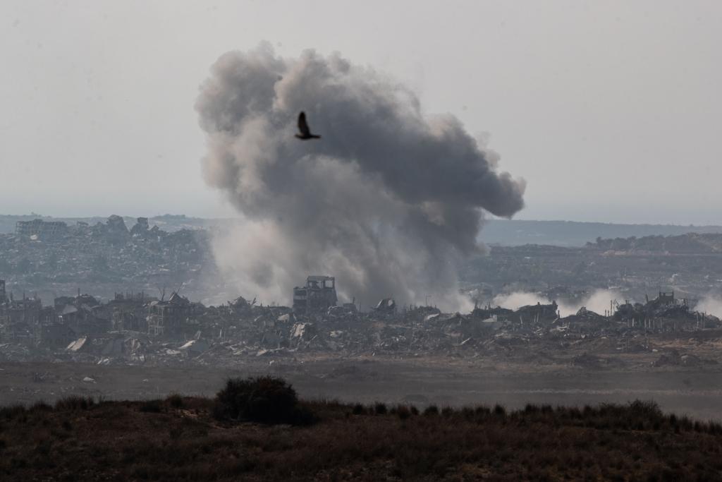 这张2025年7月10日在以色列与加沙边境以色列一侧拍摄的照片显示,加沙地带遭袭后升起浓烟。