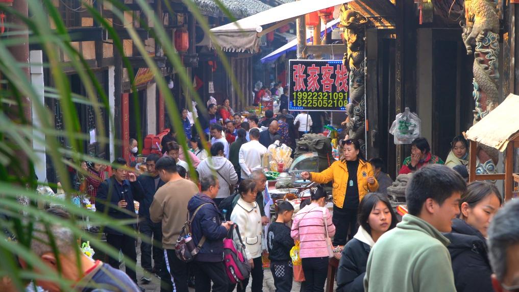 古村里最热闹的场面,要数观音庙会。每逢农历二月十九、六月十九、九月十九,从二佛寺到老村街巷,舞龙队、川剧变脸艺人轮番登场,非遗阴米、手工豆腐乳、合川桃片摊位前挤满游客。“以前庙会是村民祈福的日子,现在成了村子对外展示的窗口。”唐德红说。重庆市胜地钓鱼城文化旅游发展(集团)有限公司副总经理李亚林介绍,2025年二佛村所在的涞滩古镇片区吸引游客超100万人次,旅游收入近8500万元,古村的烟火气引来了外人,也留住了村里人。