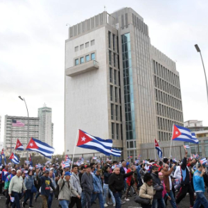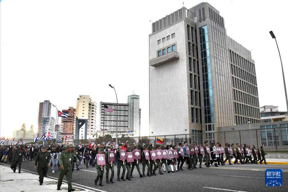 1月16日,在古巴首都哈瓦那,民众在美国驻古巴大使馆前举行反美游行。新华社发(华金·埃尔南德斯摄)