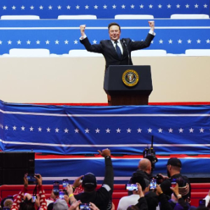 这是2025年1月20日埃隆·马斯克在美国首都华盛顿第一资本体育馆讲话的照片。新华社记者吴晓凌摄