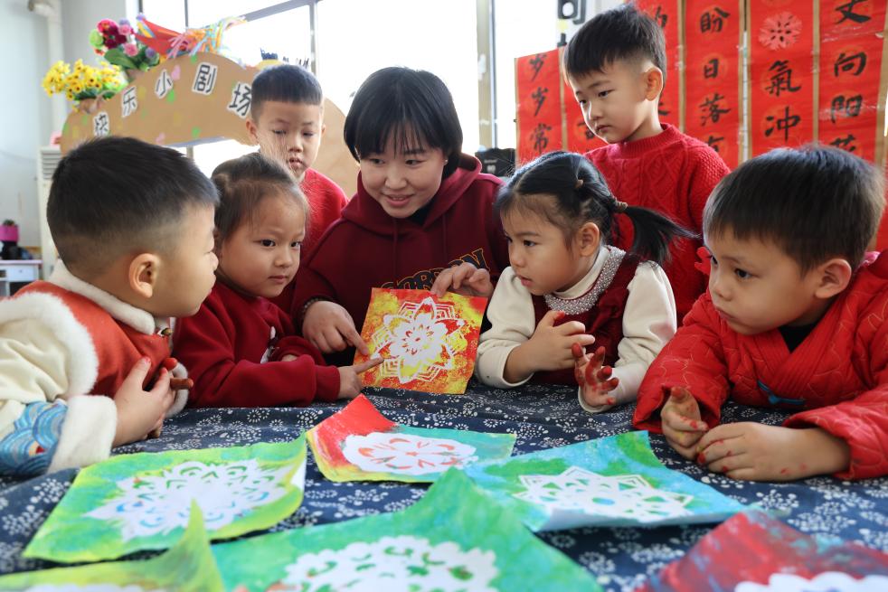 2025年12月31日,在山东省滨州市沾化区第一实验幼儿园,老师教孩子们拓窗花。新华社发(贾海宁摄)