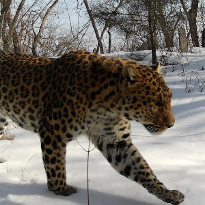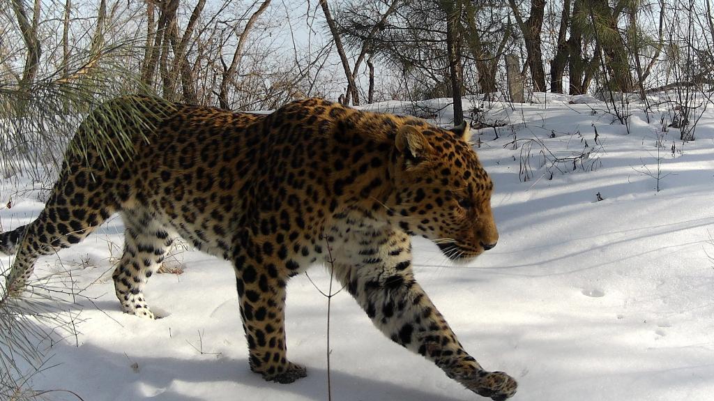 这是布设在华池县豹子川林区的红外相机拍摄到的华北豹活动画面。(素材来源:甘肃省庆阳市野生动植物保护站)