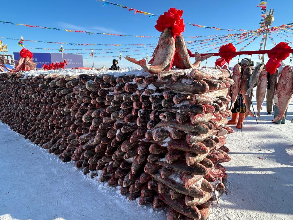 这个寓意着丰收的“鱼墙”,来自湖里打出来的鱼。刚捕捞上岸的鲜鱼,第一时间被运至这里,天然低温让鱼身迅速“速冻”,整齐码起的“鱼墙”不仅形成了天然保鲜屏障,更将“年年有鱼”的美好期许具象化,成为查干湖赠予每位游客的冬日祝福。