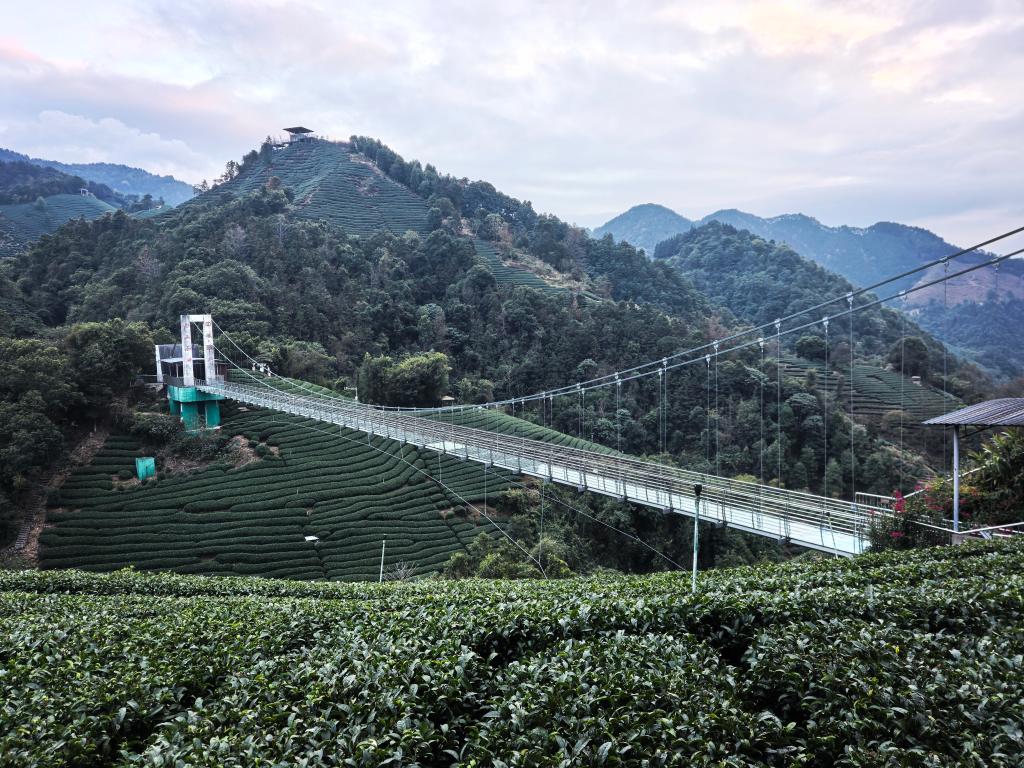 南山茶海海拔约1200米,3000亩连片茶园顺着山势蜿蜒铺展,蔚为壮观。现在,这里不仅是静态的茶园景观,更是“网红打卡点”。来到这里的游客,既可以在此体验采茶乐趣,也可以到茶山之上188米长的3D玻璃桥挑战自我。