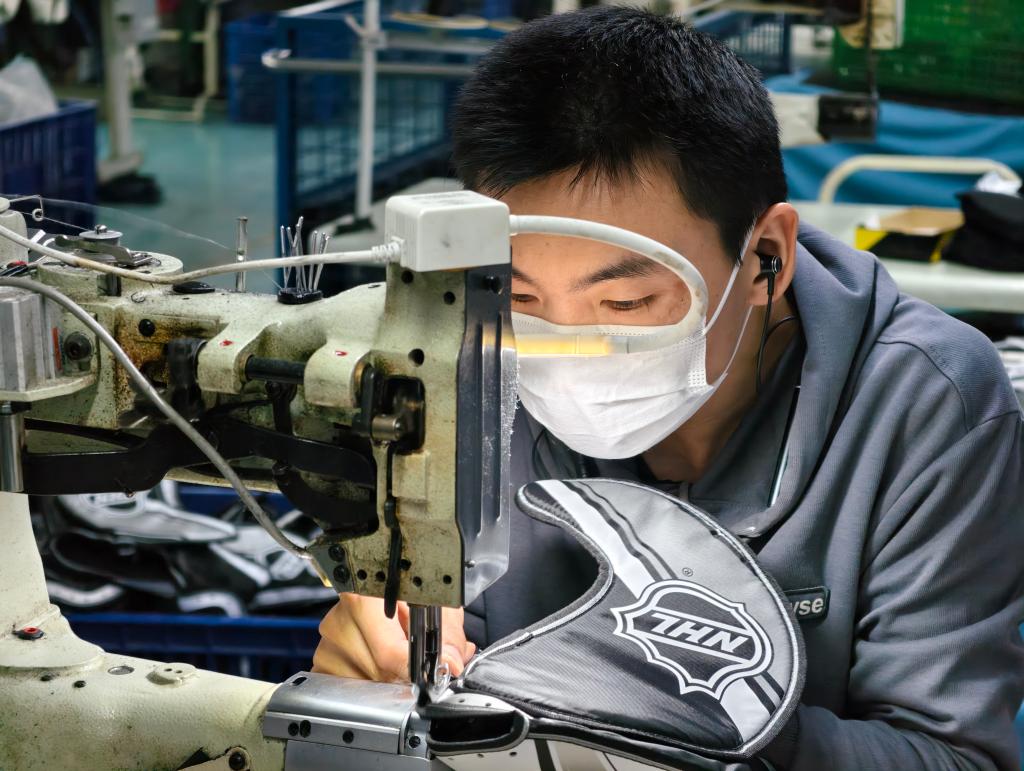 厦门博特运动器材有限公司生产线上工人在制作印有NHL标识的冰球手套。新华社记者魏培全 摄
