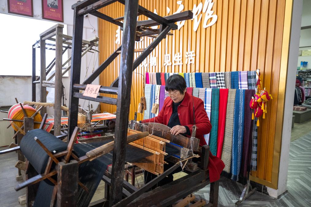 这些年,陶文成的大布生意越来越红火,产品涵盖服饰、床品、文创产品、装裱字画等20多个品类。为凸显当地红色文化底蕴,他还耗时十天,将家喻户晓的革命歌谣织进手工作品。