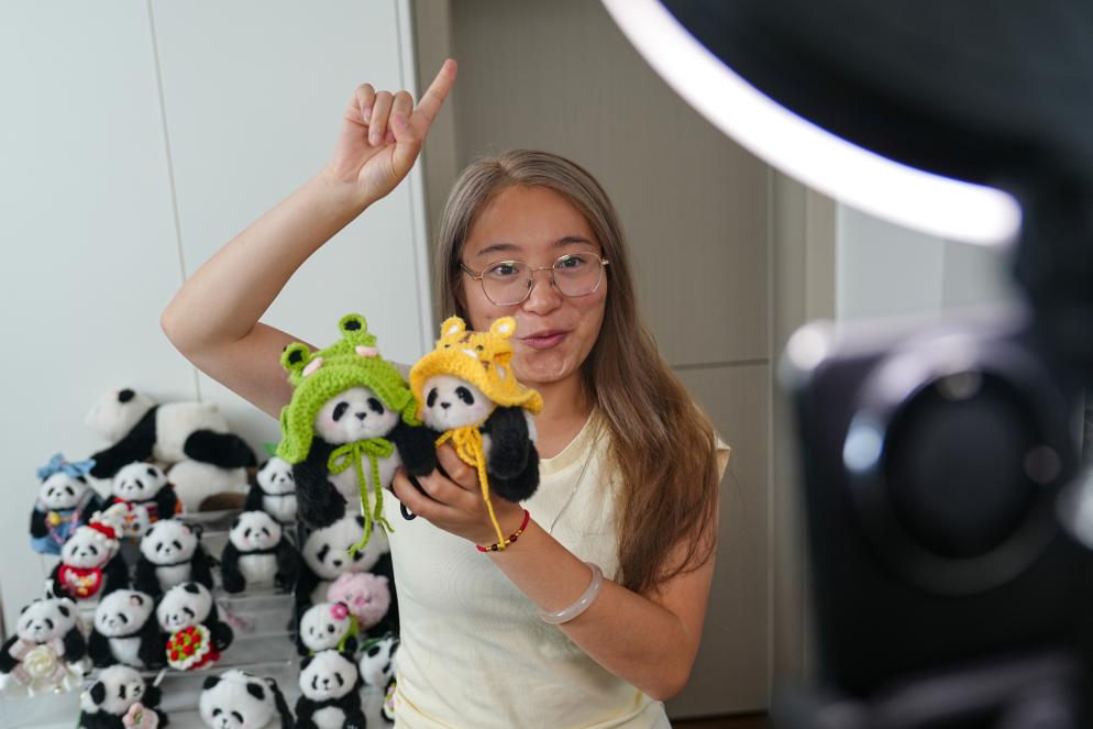 2025年8月10日,在位于成都市武侯区的四川熊猫滚滚科技有限公司直播间,主播在某电商平台直播销售“大熊猫IP”包挂产品,据统计,今年1-7月,该公司包挂产品销售额达到1200万元。新华社发(翁光建 摄)