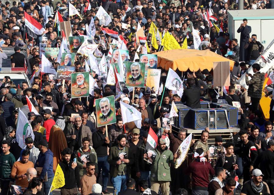 2021年1月3日,在伊拉克巴格达,人们手举苏莱曼尼和穆汉迪斯形象的海报和伊拉克国旗参加苏莱曼尼和穆汉迪斯遇袭身亡一周年悼念活动。新华社发