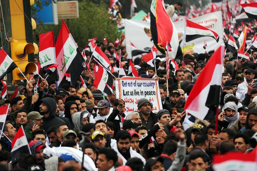 2020年1月24日,大批伊拉克人在首都巴格达举行抗议示威,要求美军撤离伊拉克。新华社发(哈利勒·达伍德摄)