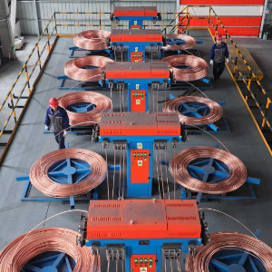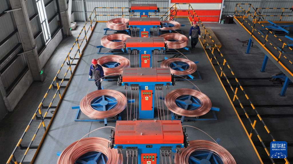 1月19日,在江苏省淮安市洪泽区一家企业车间内,工人进行铜杆产品加工生产(无人机照片)。