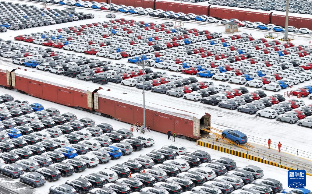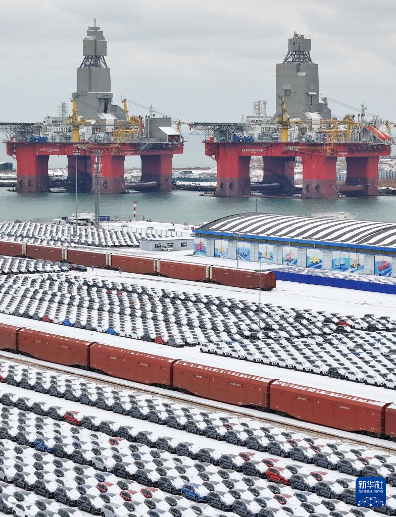 1月18日,在山东港口烟台港,国产汽车从商品车班列中倒车驶出到码头集结,等待装船出口(无人机照片)。