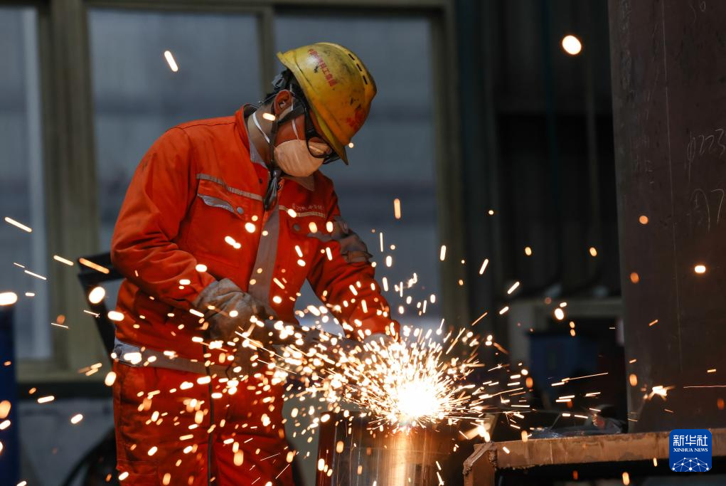 1月19日,在天津市滨海新区,海上油气平台建设工人进行打磨作业。