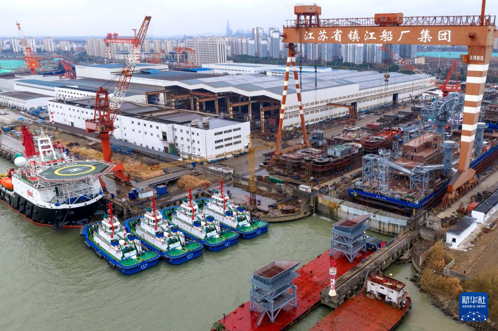 1月11日,在位于江苏省泰州市高港区的泰州三福船舶工程有限公司生产基地,多艘大型船舶在建造中(无人机照片)。
