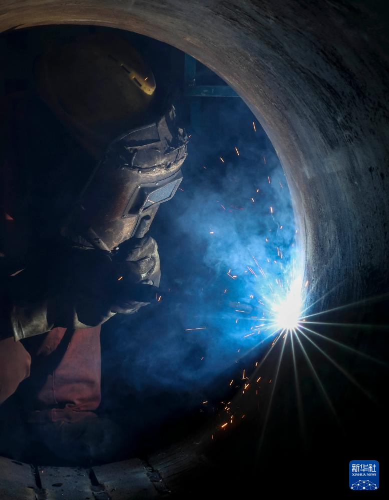 1月19日,在中铁科工集团武汉江夏制造基地,技术工人对盾构配件进行焊接作业。