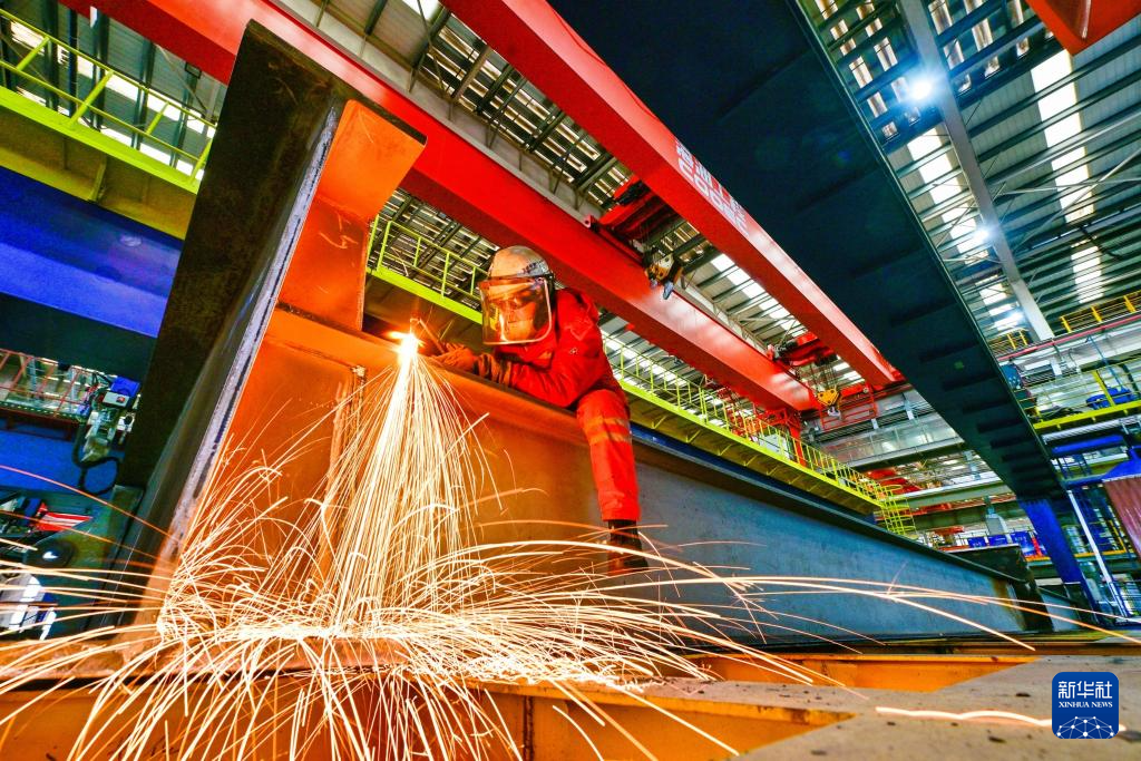 1月19日,在中铁科工集团武汉江夏制造基地,技术工人对门吊配件进行打磨作业。