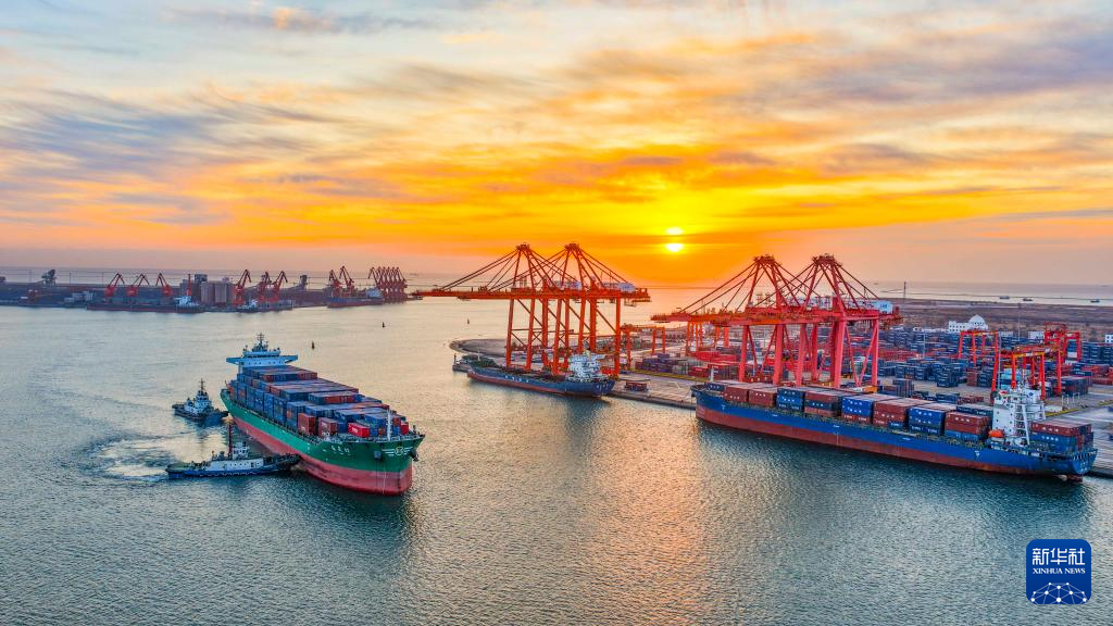 1月19日,轮船停泊在河北省唐山港京唐港区集装箱码头进行装卸作业(无人机照片)。