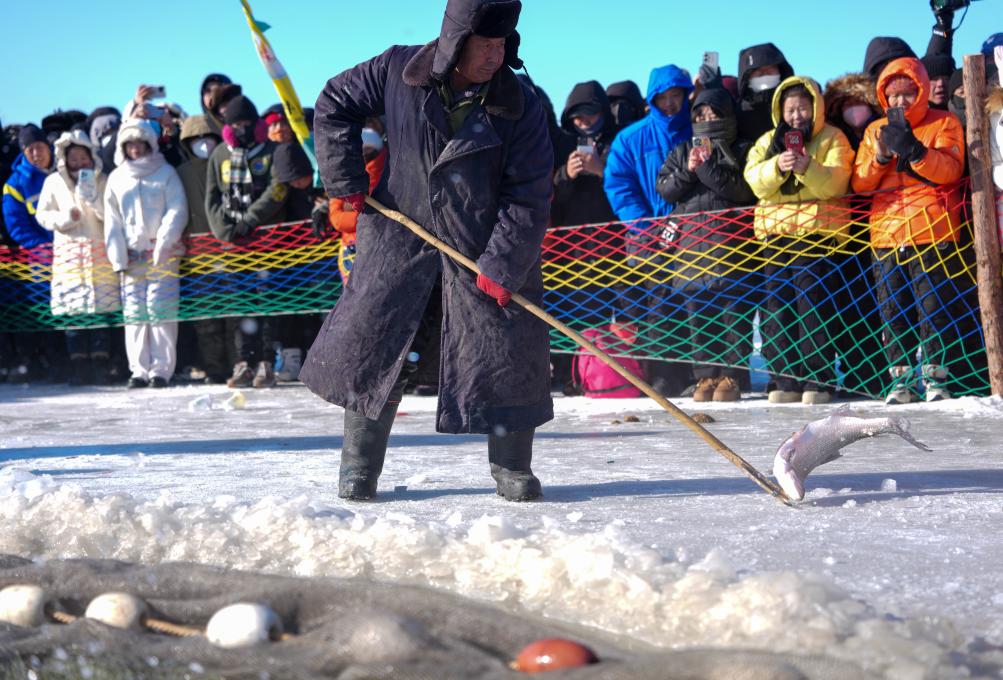 1月8日,查干湖上,人工凿冰、马拉绞盘、冰下走网等渔猎技艺有序展开。新华社记者 颜麟蕴 摄