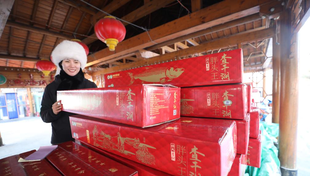 图为曲三妹正在清点货物,为查干湖鲜鱼打包装盒,为顾客发送快递。新华社发