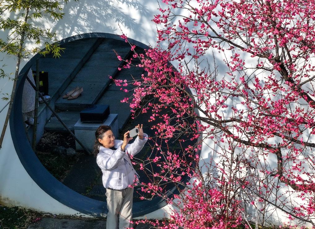 1月15日,在湖北省武汉市东湖梅园,游客拍摄梅花(无人机照片)。新华社发(赵军 摄)