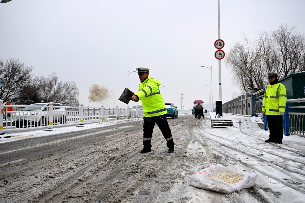 1月19日,在安徽省亳州市灵津渡大桥,当地交警正在进行清雪除冰作业。新华社记者黄博涵 摄