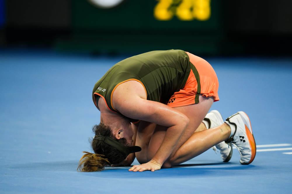 2025年10月4日,诺斯科娃在2025中国网球公开赛女单半决赛后跪地庆祝。这是她职业生涯首次打入中网女单决赛。