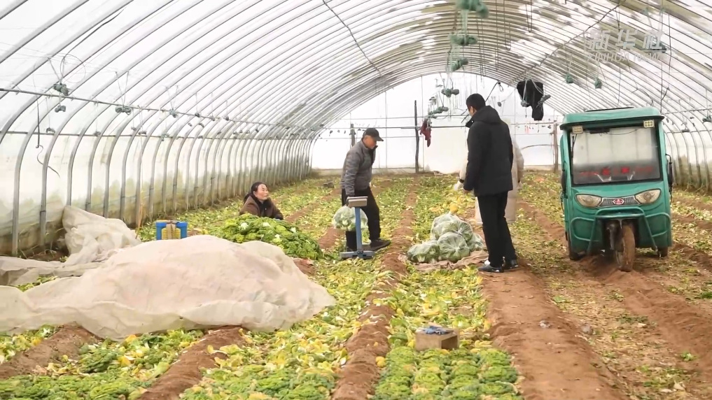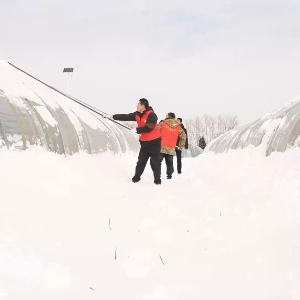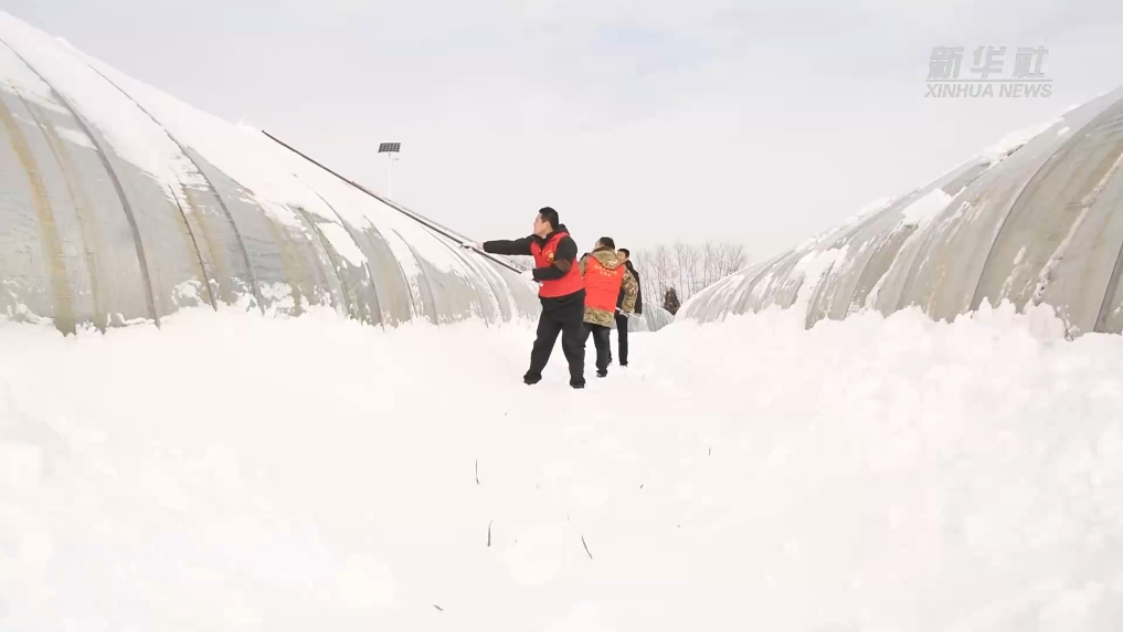 在亳州市谯城区五马镇的常青园蔬菜生产基地,大棚上覆盖了厚厚的积雪。为了防止积雪对农业设施造成影响,当地组织志愿者帮助种植户清理积雪。