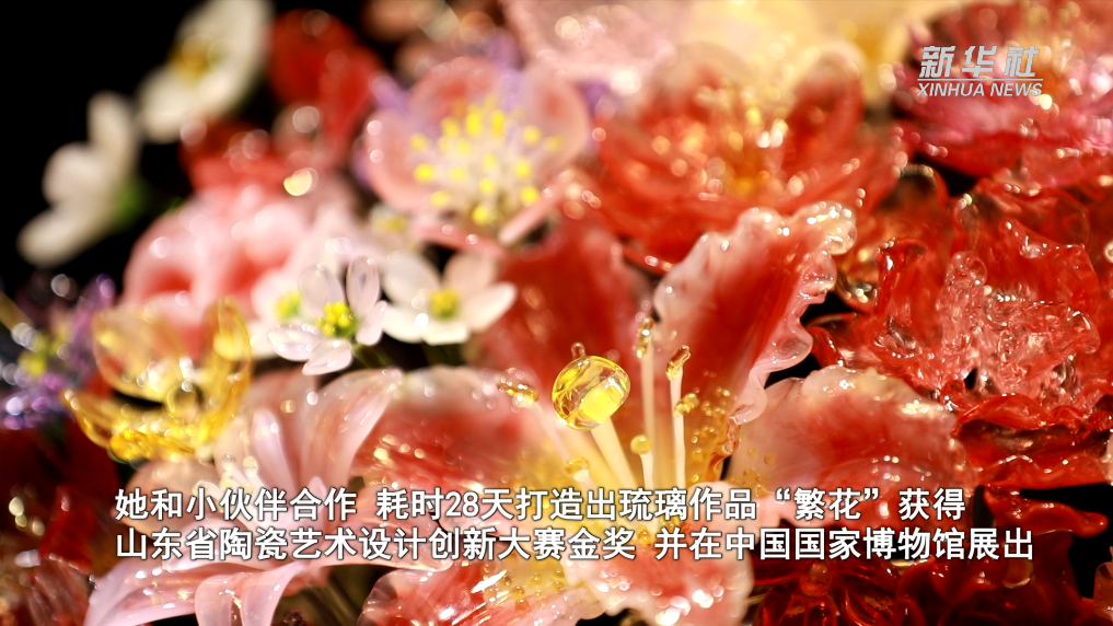 淄博琉璃烧制技艺是国家级非物质文化遗产代表性项目,王婧瑶于2022年开始学习相关技艺。在熟练掌握基本技艺后,她开始大胆加入创新元素,将淄博琉璃与泉州簪花、黄梅戏等传统文化符号跨界融合,创作出兼具传统与现代风格的国潮艺术品。她和小伙伴合作打造出的琉璃作品“繁花”,获得山东省陶瓷艺术设计创新大赛金奖,并在中国国家博物馆展出。