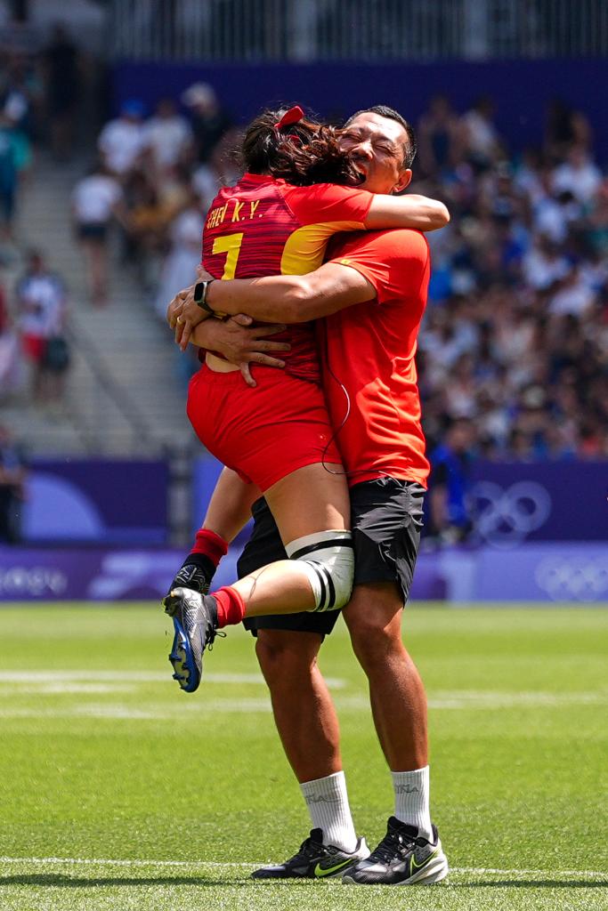 2024年7月30日,中国队选手陈可怡(左)在赛后与教练相拥庆祝。当日,在巴黎奥运会七人制橄榄球女子5-8名排名赛中,中国队19比15战胜英国队。新华社记者 许畅 摄