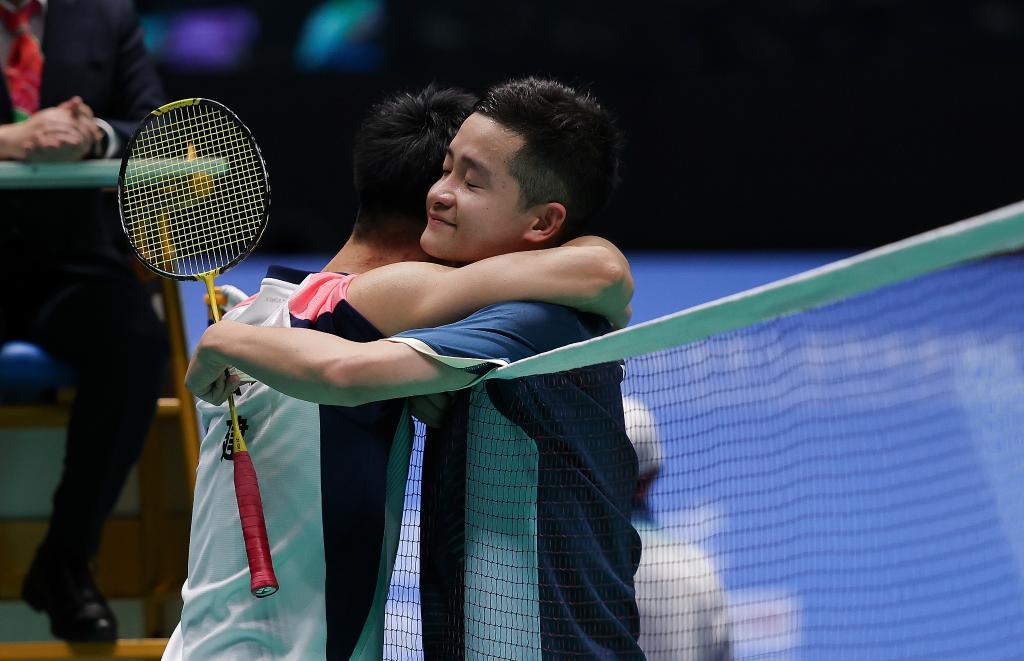 2025年12月14日,福建队选手冯国忠(左)在比赛后与贵州队选手文耀东拥抱。当日,全国第十二届残疾人运动会暨第九届特殊奥林匹克运动会羽毛球比赛在澳门举行,福建队选手冯国忠、贵州队选手文耀东和广东一团队选手颜文海获得听障男子单打冠亚季军。新华社记者 毛思倩 摄