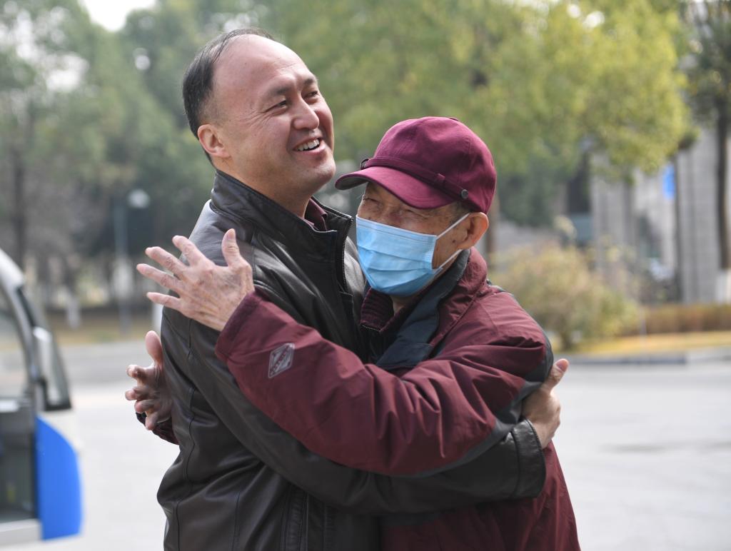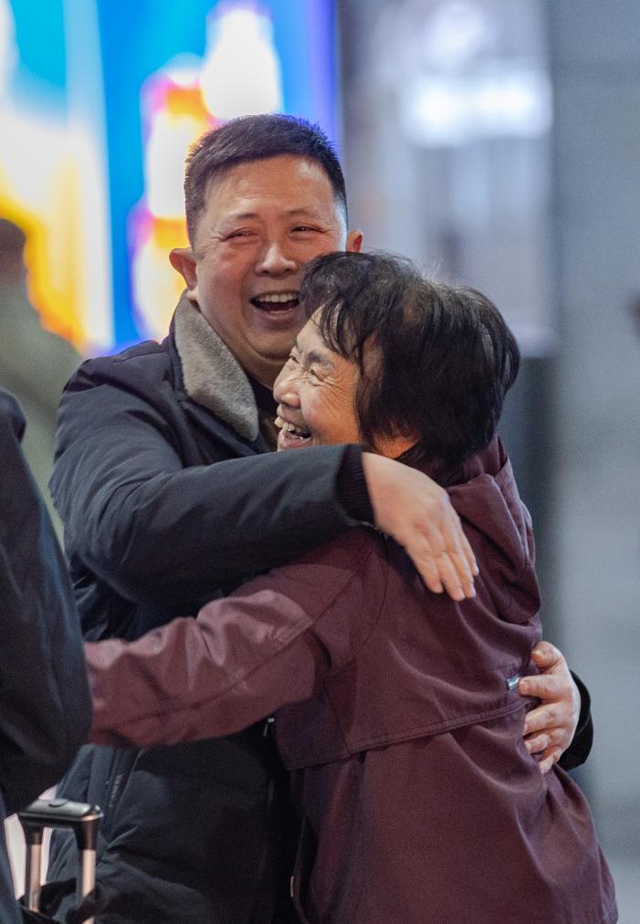 2024年2月5日,在重庆北站北广场,赵兴松(左)与从黑龙江来重庆过年的姨妈拥抱。新华社记者 黄伟 摄