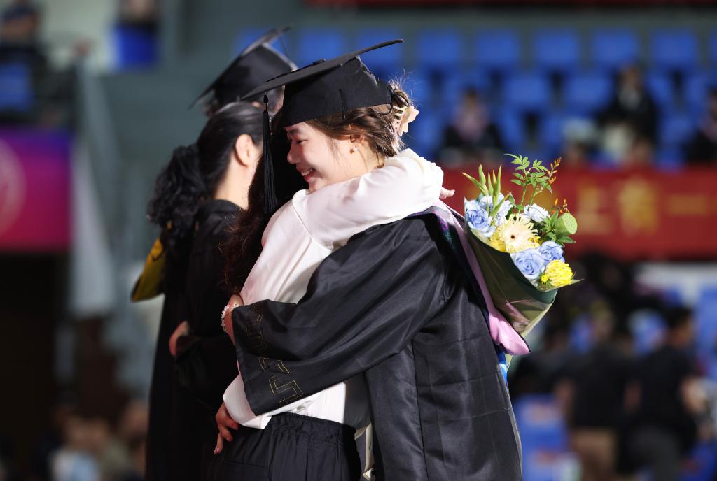 2025年6月19日,东南大学2025年本科生毕业典礼上,毕业生代表和教师代表拥抱。新华社发 (蔡敦昊 摄)