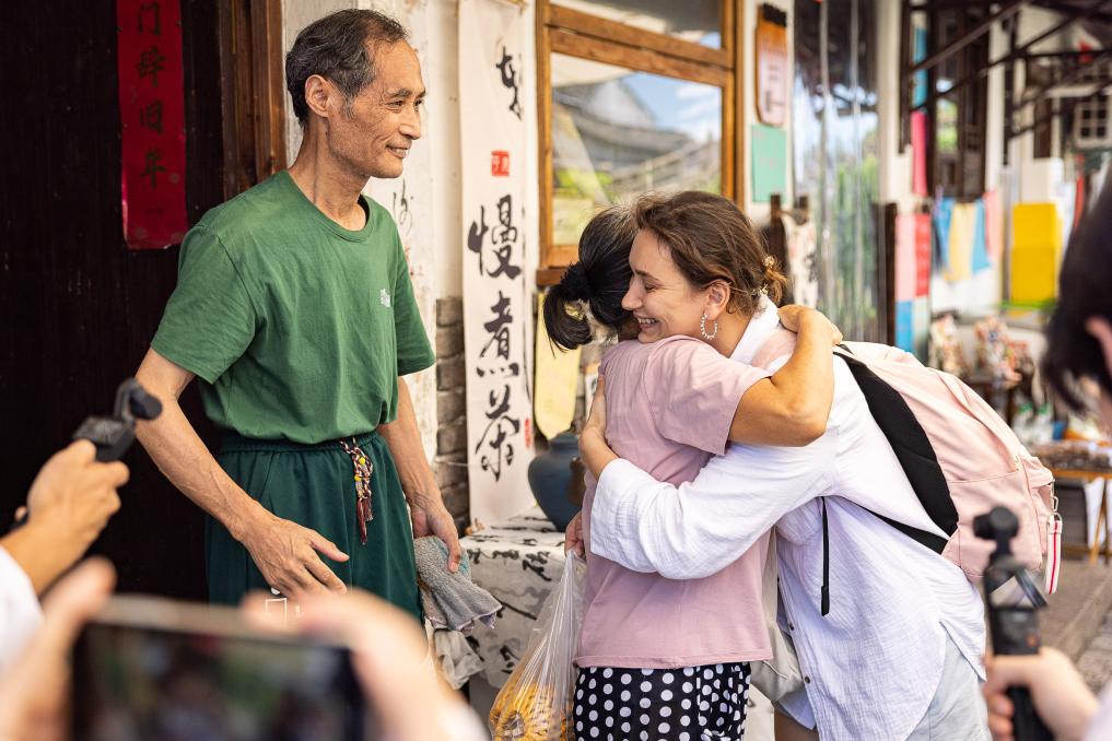 2025年7月1日,莎河娜斯在绍兴与陶奶奶拥抱问候。莎河娜斯是湖州师范学院毕业生,她在自己的毕业旅行时,曾在八字桥边救起意外落水的陶奶奶。 新华社发(伊凡摄)