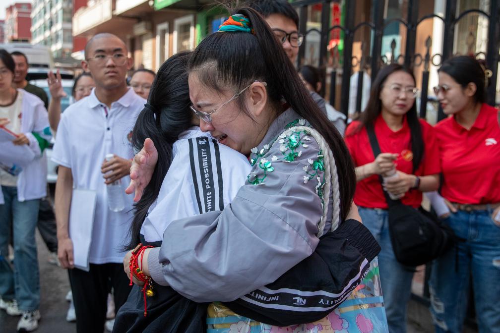 2024年6月7日,在黑龙江哈尔滨市第七十二中学考点,一名来自哈尔滨市第十二中学的老师与考生拥抱。当日,2024年全国高考拉开帷幕。新华社记者 张涛 摄