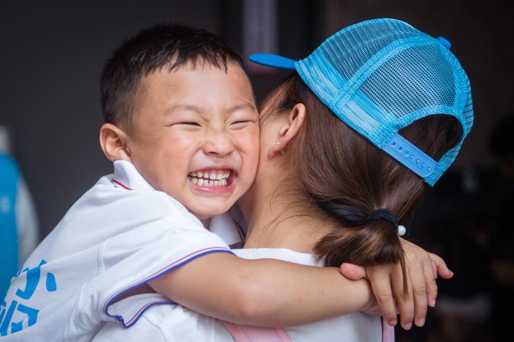 2023年8月24日,留守儿童在活动现场与母亲拥抱。 当日,2023年全国留守儿童关爱保护“百场宣讲进工地”活动在中建三局武汉新城光谷科学岛项目举行。新华社记者 伍志尊 摄