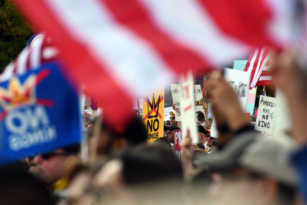 2025年10月18日,在美国华盛顿,人们参加示威游行活动。包括纽约、洛杉矶、华盛顿、芝加哥等主要城市在内的美国多地当天举行示威游行,反对暴力打击移民、强行派遣国民警卫队进入美国城市、加征关税等多项特朗普政府执行的政策。新华社记者李睿摄