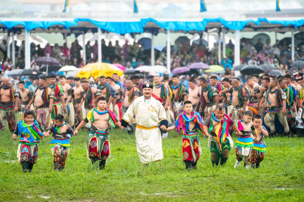2025年7月19日,在内蒙古锡林郭勒那达慕风情园,搏克手们在那达慕开幕式上亮相。