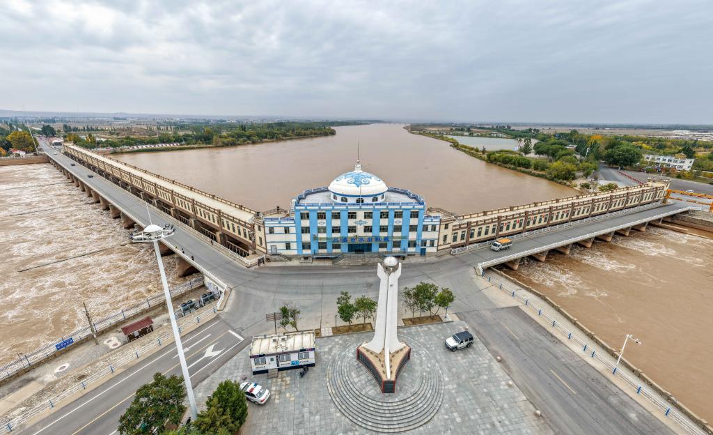 这是2025年10月16日在内蒙古巴彦淖尔市磴口县拍摄的开闸放水的三盛公水利枢纽。