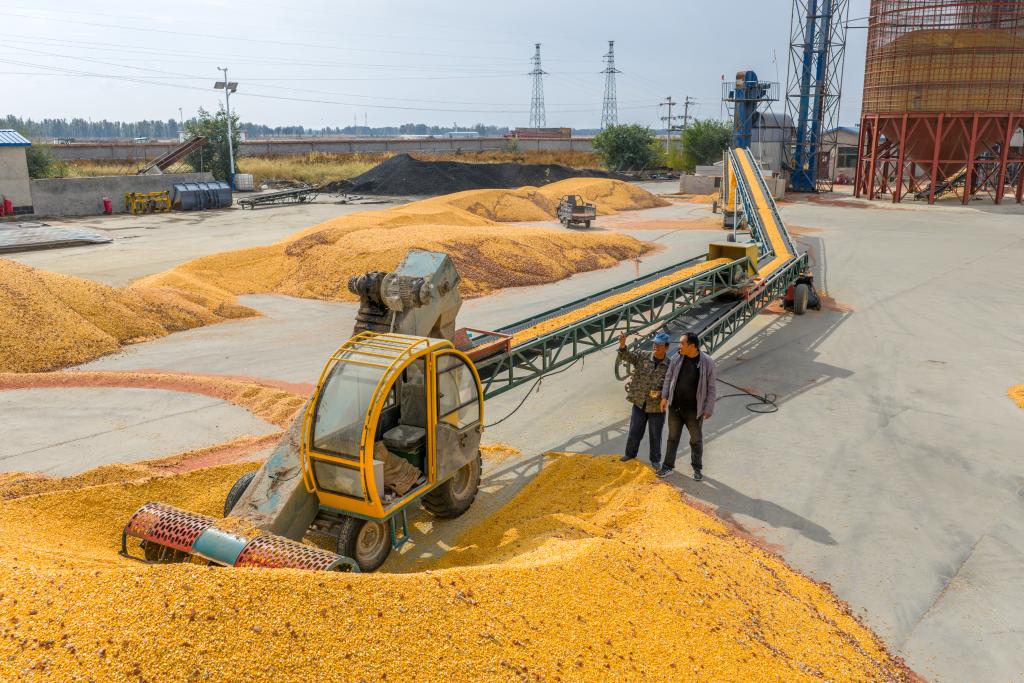 2025年10月15日,在内蒙古巴彦淖尔市乌拉特前旗,工作人员遥控操作农机将玉米送入烘干塔。
