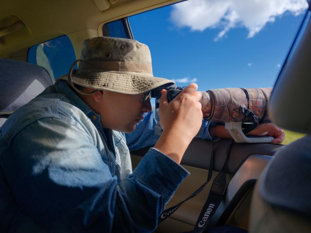 2025年9月16日,在额尔古纳湿地,宝金财在车中使用长焦镜头拍摄鸟类。