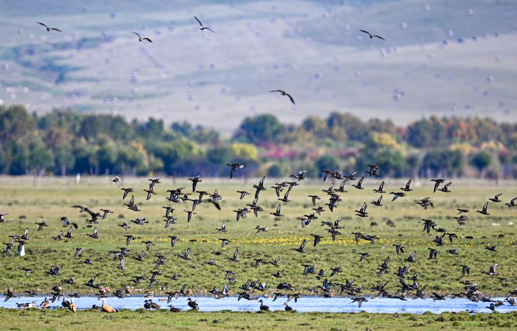2025年9月15日在额尔古纳湿地自然保护区拍摄的赤麻鸭。 新华社记者 贝赫 摄