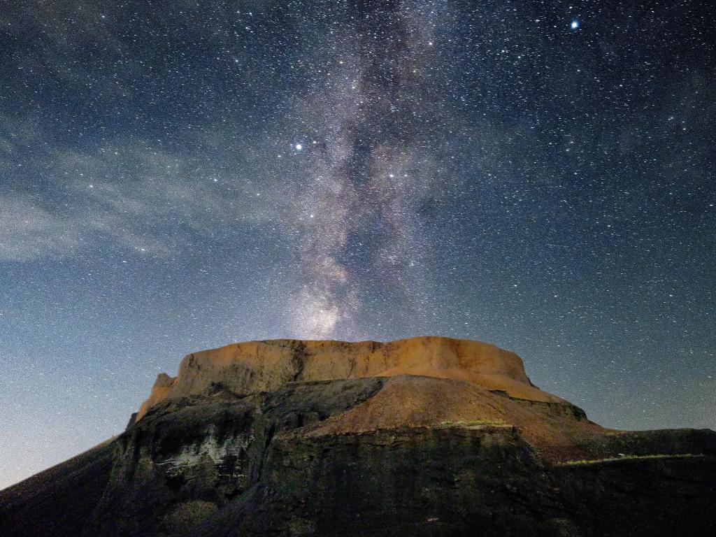 这是2025年8月30日在内蒙古乌兰察布市察哈尔右翼后旗乌兰哈达火山地质公园内拍摄的银河下的6号火山(堆栈合成照片)。
