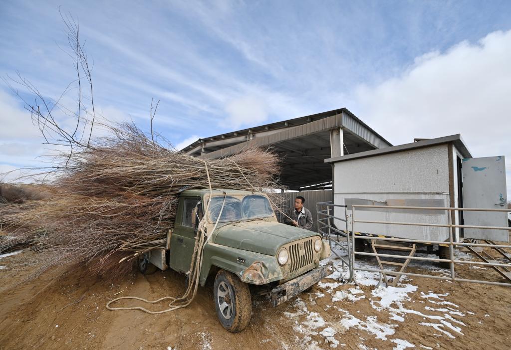 2025年3月25日,锡林郭勒盟正镶白旗的农牧民将红柳枝条打包装车。正值春季,在位于内蒙古锡林郭勒盟正镶白旗境内的浑善达克沙地中,当地农牧民利用割灌机对红柳进行平茬作业。平茬后的红柳枝条可以作为沙障的原材料,成为治沙“利器”。农牧民通过参与平茬、分拣、切割、捆扎红柳条获得劳动收入,实现“生态治沙、群众增收”的双赢局面。