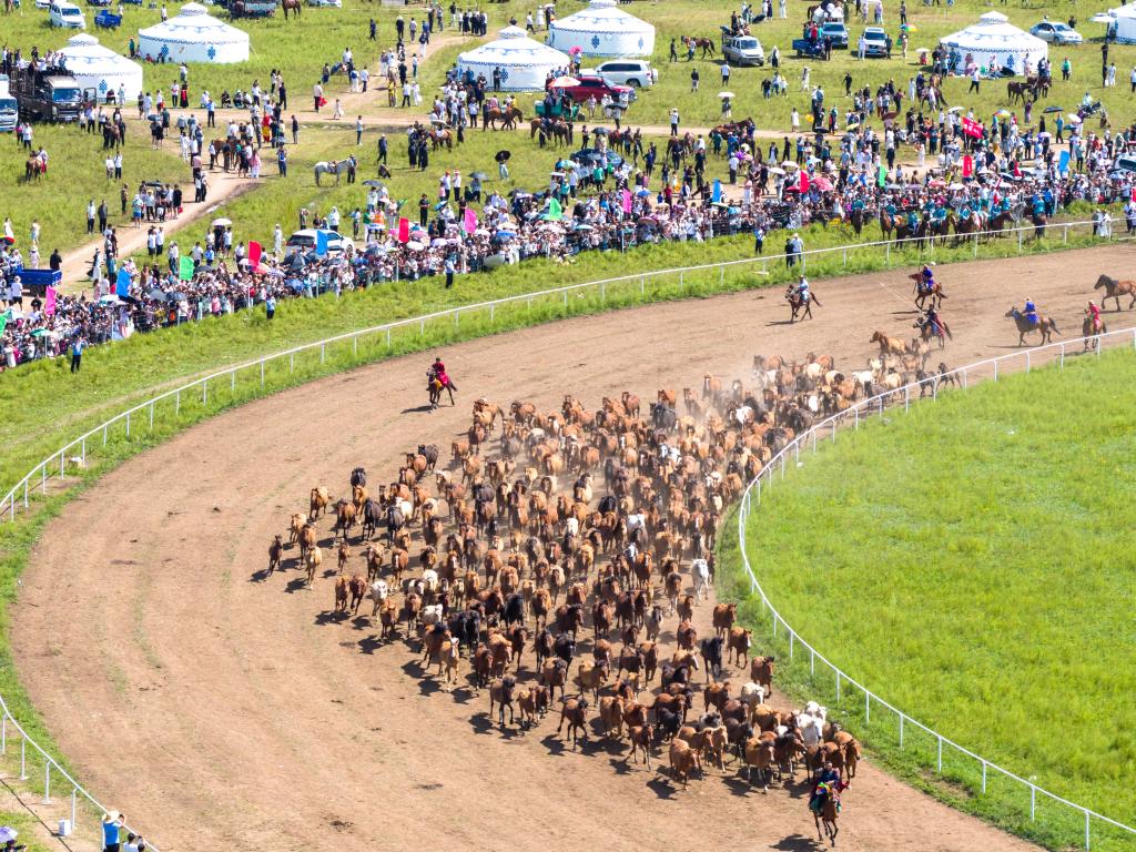 2025年8月7日,游客在农牧民那达慕大会上观看跑马表演。