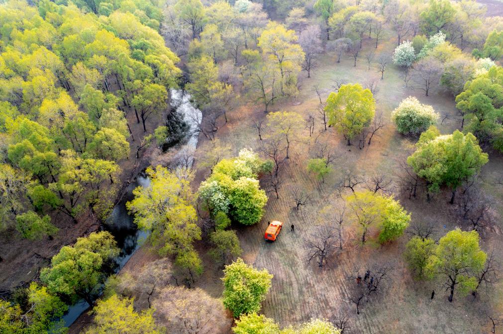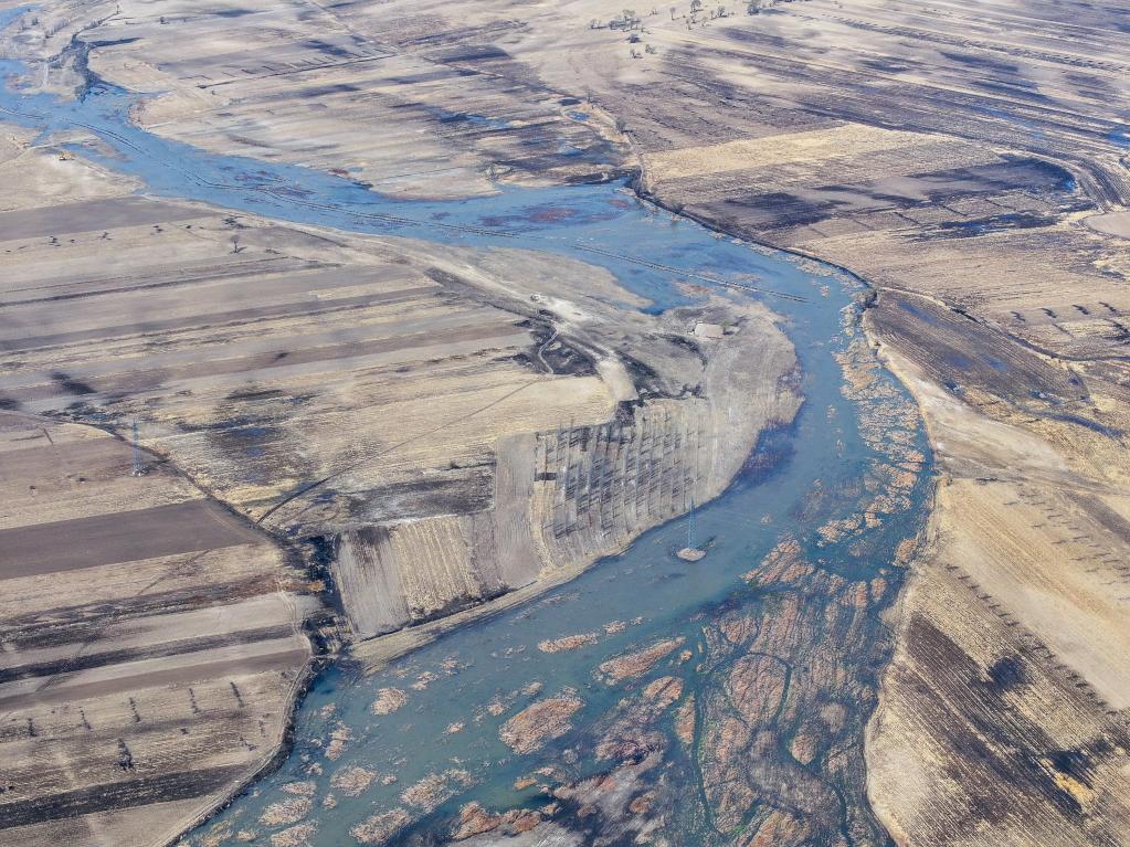 2025年4月10日,西辽河干流水头通过通辽市科尔沁左翼中旗门达镇太平庄村北(无人机照片)。 新华社记者 连振 摄