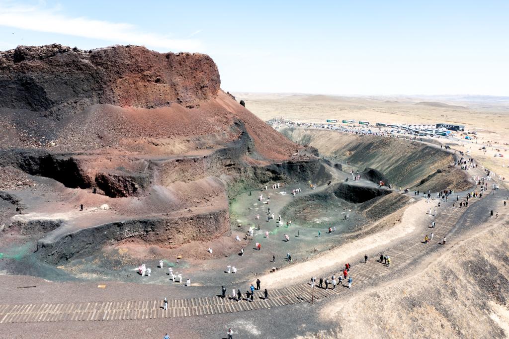 2025年5月3日,游客在内蒙古乌兰察布市察哈尔右翼后旗内蒙古乌兰哈达火山地质公园6号火山游玩(无人机照片)。6号火山曾遭到盗挖,留下了黢黑的矿坑。